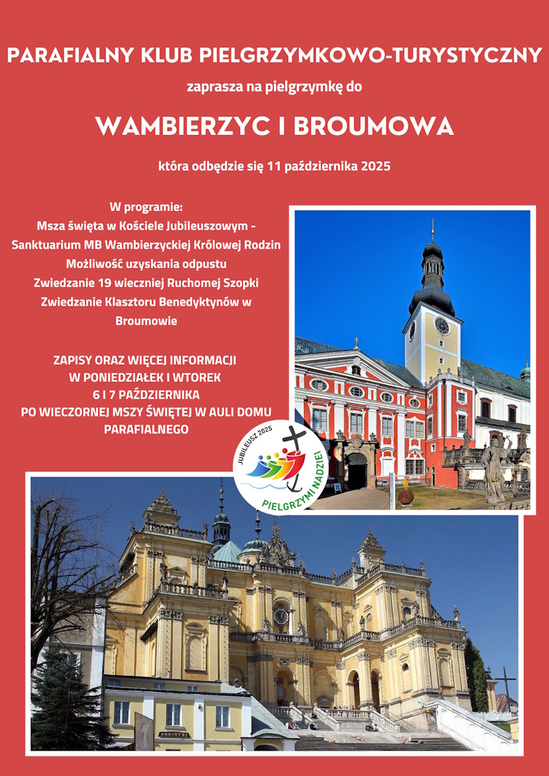 Klub Pielgrzymkowo –Turystyczny zaprasza na Pielgrzymkę samochodową do Kościoła Jubileuszowego w Wambierzycach – Bazyliki Nawiedzenia Najświętszej Matki Bożej i mieszczącym się w niej Sanktuarium Najświętszej Maryi Panny Matki Bożej Wambierzyckiej Patronki Rodzin w ramach obchodów Roku Jubileuszowego 2025. Pielgrzymka odbędzie się w dniu 11.10.2025 r (sobota). W programie pielgrzymki nawiedzenie Bazyliki i Msza Święta w…