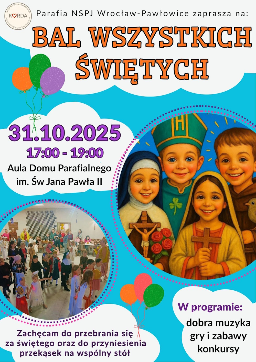 Grupa Artystyczna KORDA zaprasza na Bal Wszystkich Świętych w dniu 31.10.2025.godz. 17.00 w Auli domu Parafialnego. Udział w balu jest bezpłatny, prosimy tylko o przyniesienie przekąsek na wspólny stół. W programie wiele atrakcji. Zapraszamy całe rodziny, zachęcamy do przebrania się za postacie Świętych