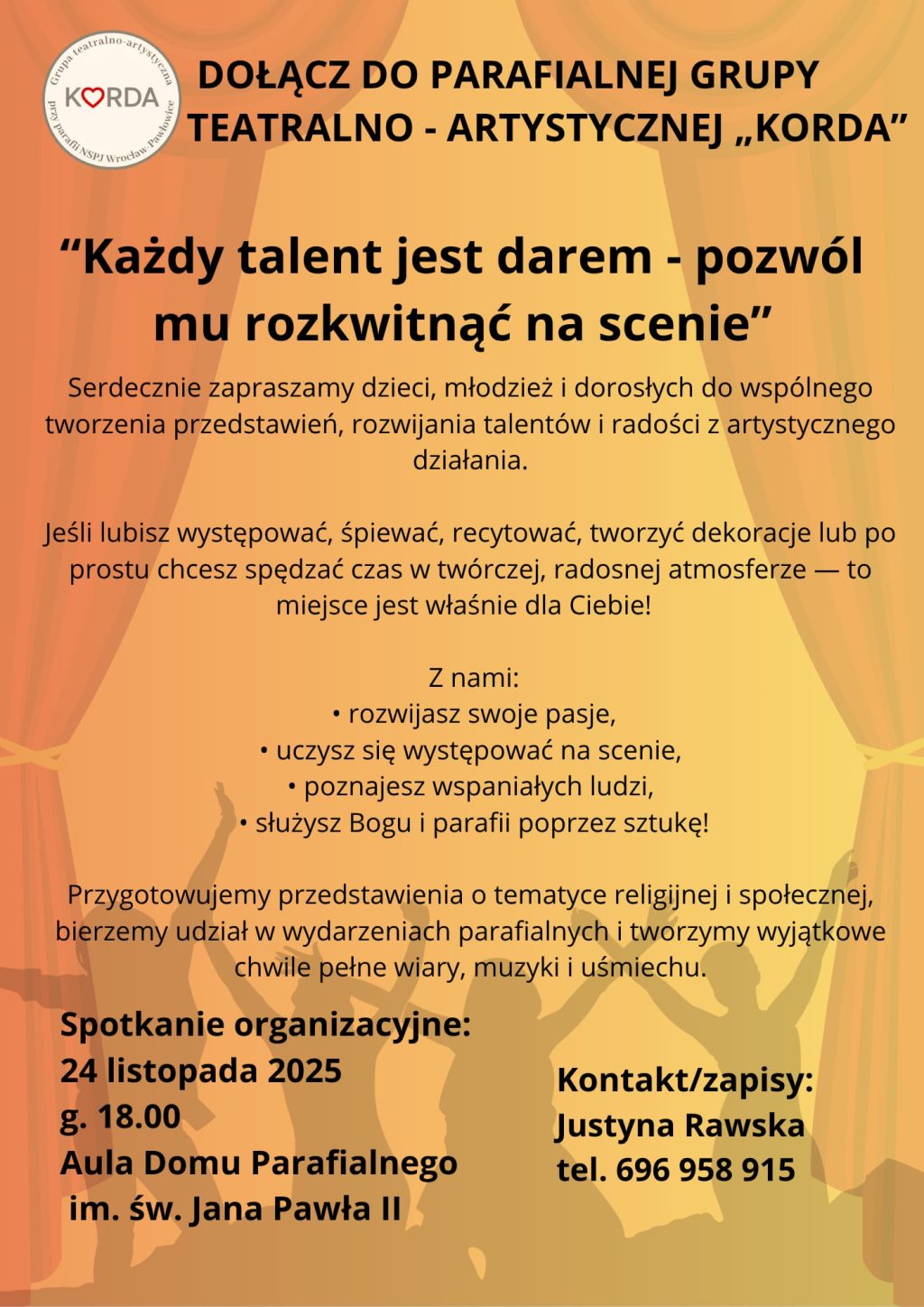 Grupa teatralno-artystyczna KORDA zorganizowała w dniu 11.11.2025 Biesiadę Patriotyczną w Auli Domu św. Jana Pawła II. W programie była Pantomima „Dzieje Polski”, występy indywidualne dzieci, wspólne śpiewanie piosenek patriotycznych, słodki poczęstunek.
