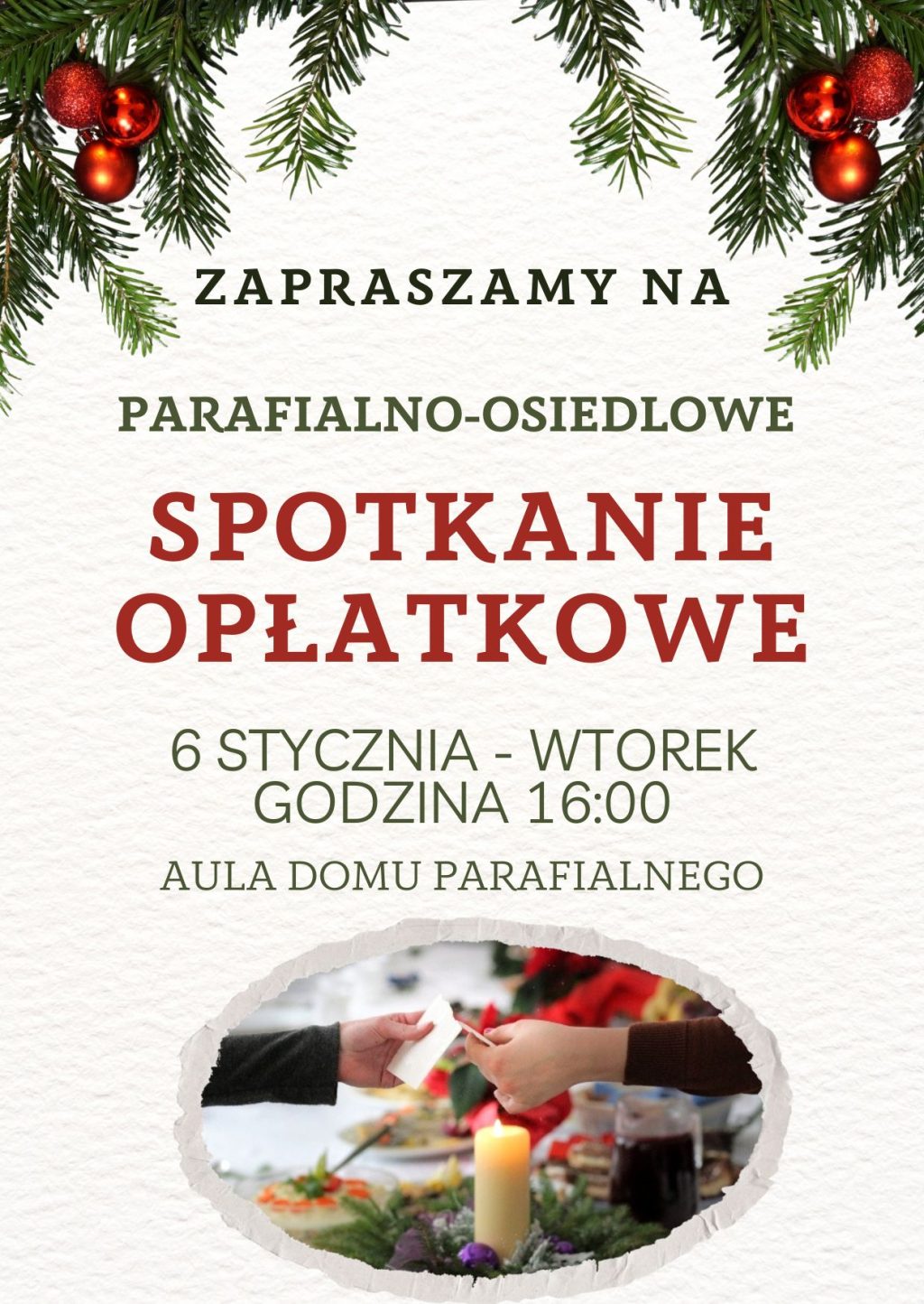 6 stycznia na godzinę 16:00 serdecznie zapraszamy wszystkich chętnych do spotkania opłatkowego i kolędowego współorganizowanego przez Radę Parafialną i Radę Osiedla.