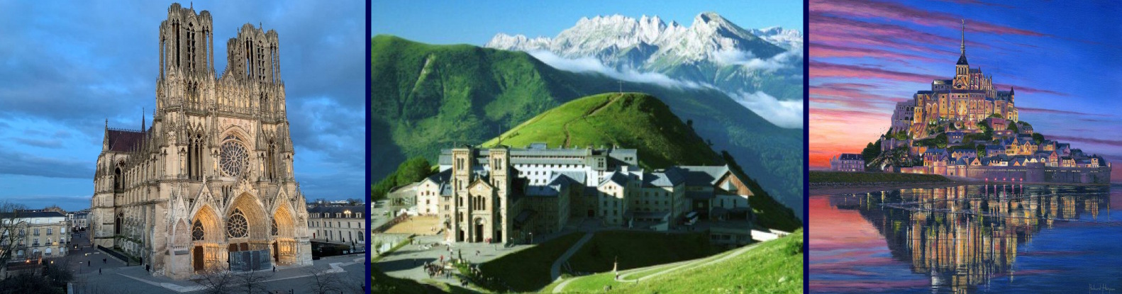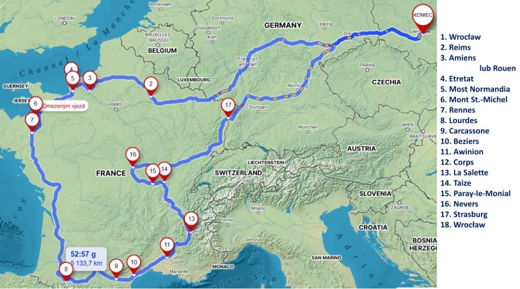 Reims – Amiens lub Rouen – Etretat – Mont-Saint-Michelle – Rennes – Lourdes – Carcassone – Beziers – Awinion – Corps – La Salette – Ars – Taize – Paray-le-Monial – Nevers – Strasburg
