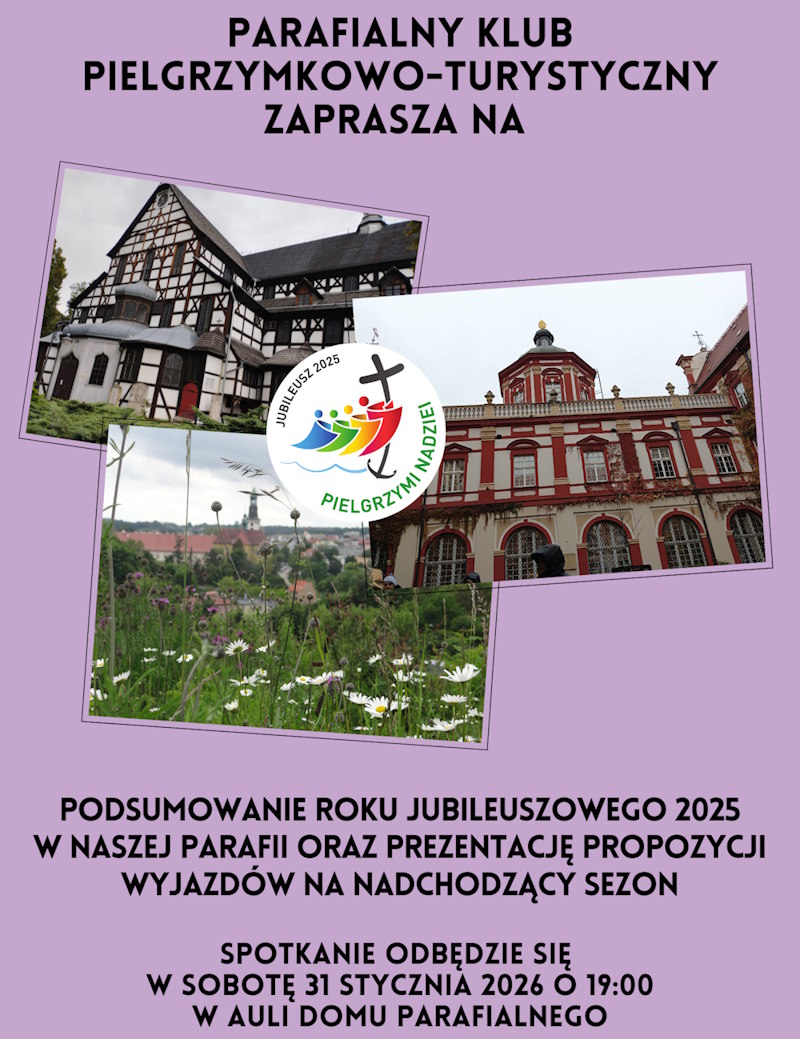 Klub Pielgrzymkowo – Turystyczny zaprasza na Prezentację podsumowującą nasze Pielgrzymki w Roku Jubileuszowym 2025. Spotkanie odbędzie  się w  sobotę   31.01.2026r  o godzinie 19:00 w auli Domu Parafialnego. Serdecznie zapraszamy.